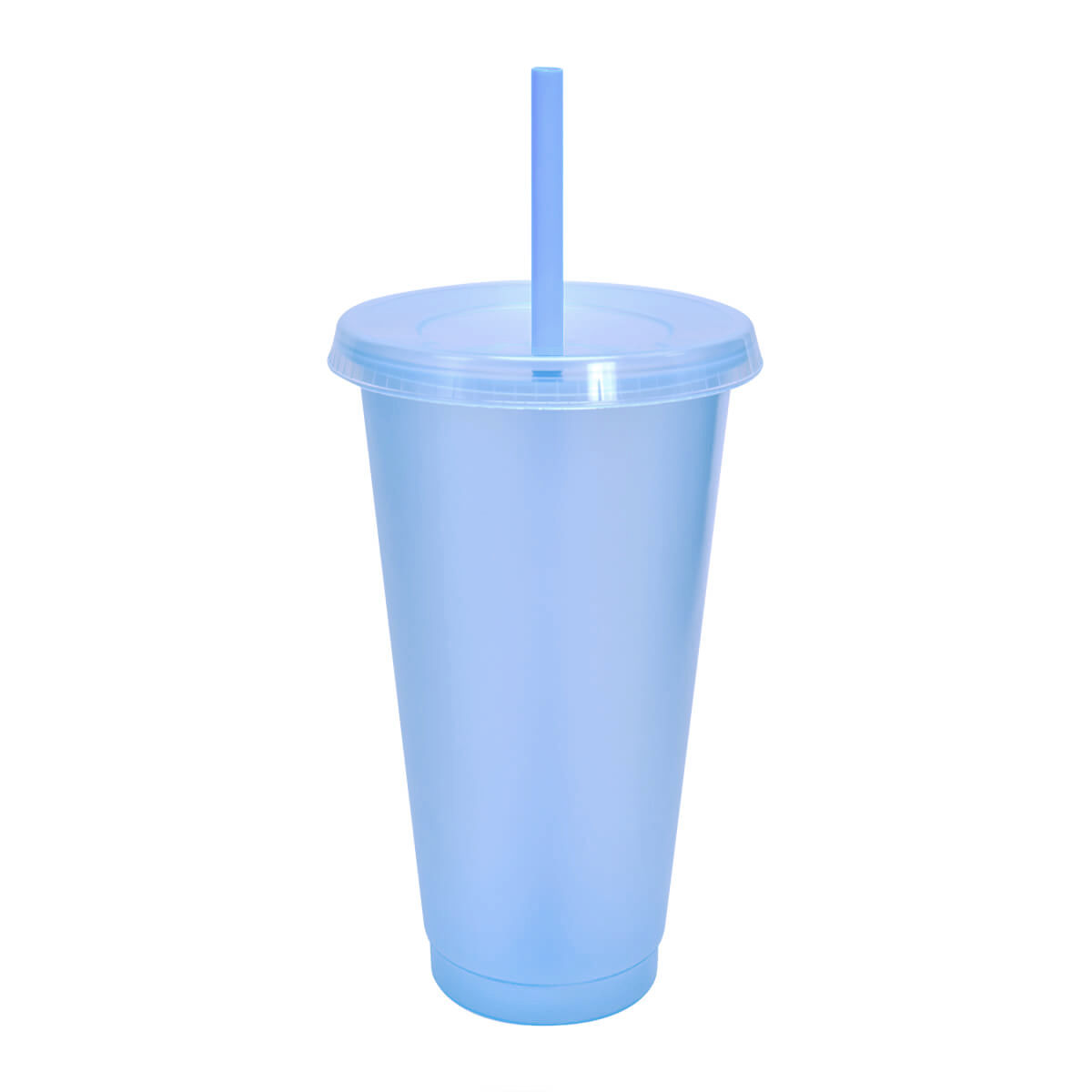 Vaso de plástico con tapa push y popote. Capacidad 27 oz. Base de 6.4 cm de diámetro.